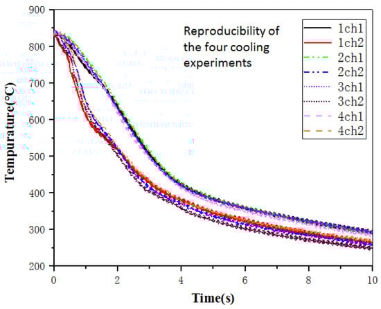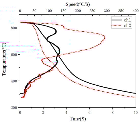 The heat transfer process around the bearing outer ring is very complex when the bearing outer ring is quenched using quench oil. It is often accompanied by nucleation boiling of the hot fluid, generation of a vapor film on the outer surface of the bearing outer ring, and film boiling and convection phenomena of the hot fluid as the vapor film is peeled off. In particular, it is often very difficult to determine the heat transfer behavior and heat transfer coefficient of the outer surface of the bearing in this complex set of circumstances. However, if the heat transfer coefficient of the outer surface of the bearing cannot be correctly assimilated, it is also impossible to simulate the temperature field, stress–strain field, and changes in the internal metal structure of the bearing. Therefore, in this thesis, in order to assimilate the heat transfer coefficient of the outer surface of the bearing during quenching, a method is proposed in which two 1.1 mm holes are machined orthogonally (90°) in the outer ring of the bearing, as shown in Figure 3, and then a 1 mm diameter K-type thermocouple is inserted into the top of the holes. Since the thermocouple is soldered with silver paste inside the holes, which are only 0.01 mm from the outer surface, the measured cooling curve, with a high degree of accuracy, can be achieved. The measurement device is shown in Figure 4. The measured cooling curve is shown in Figure 5. Moreover, ch1 and ch2 in Figure 4 represent the temperature change curve detected by thermocouples in different directions. If the height direction is defined as the Z direction, ch1 is the detection point in the X direction of the ring, and ch2 is the detection point in the Y direction of the ring. Our current aim is to first solve the practical problem of obtaining the cause of the oval shape of the bearing outer ring after quenching. From this point of view, our proposed heat transfer coefficient scheme was substituted into the multi-field coupled simulations to obtain elliptical deformation results that are reasonable and close to the experimental results. We are aware of the uncertainties associated with this approach. In order to guarantee the experimental accuracy, we performed four cooling curve tests under the same process conditions, and the experimental results show a highly reappeared cooling rate curve. The cooling rate curves have been calculated according to the cooling curves, as shown in Figure 6. The cooling rate was calculated with the initial data in order to show the validity of the experimental tests because the cooling experiments showed a highly reappeared cooling rate curve. We can see from the measured cooling curve that the cooling curve and the cooling rate (gradient) are completely different in the two orthogonal directions. This indicates that the outer ring of the bearing produces a completely different heat transfer near the outer surface of the bearing due to the complex phenomenon of the thermal fluid (quenching oil) during the quenching process. This results in a large difference in the cooling in the two orthogonal directions. This is, of course, a very interesting phenomenon, and further visualization studies are needed to explain the mechanism of the problem.