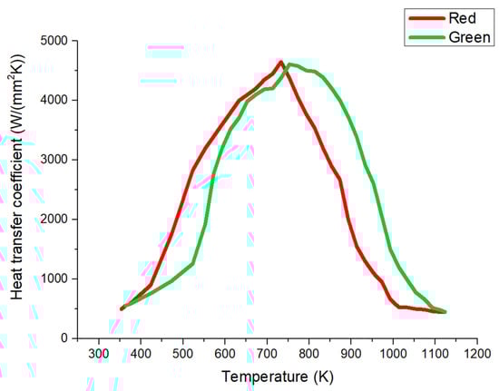 In Figure 7, the two different colors represent the different heat transfer coefficient taken rules, which should also correspond to the rule when the heat transfer boundaries are set. The red curve is obtained from the cooling curve by the No. 1 thermocouple (ch1 curves) according to the concentrated heat capacity method, and the green curve is obtained from the cooling curve by the No. 2 thermocouple (ch2 curves). Heat transfer boundaries were set, as shown in Figure 8.