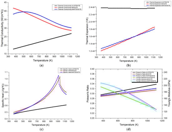 Bearing steel GCr15 has a commonly used bearing material, but all the thermal physical properties and mechanical properties that have changed with the temperature involved in the heat treatment of GCr15 could hardly be retrieved in the past literature. To this end, we used the material design software JMatPro [] to calculate the thermal properties and mechanical properties of GCr15, and at the same time, we calculated the continuous cooling curve (CCT) of GCr15. The thermal physical properties and mechanical properties of each phase, such as the thermal conductivity, thermal expansion coefficient, specific heat, Poisson’s ratio, Young’s modulus, yield stress, and hardening parameter, were obtained by JMatPro and are shown in Figure 9.