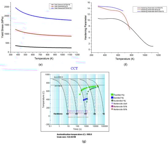 GCr15 thermal physical properties and mechanical properties: (a) thermal conductivity; (b) coefficient of thermal expansion; (c) specific heat; (d) Poisson’s ratio and Young’s modulus; (e) yield stress; (f) hardening parameter; (g) continuous cooling curve of GCr15.