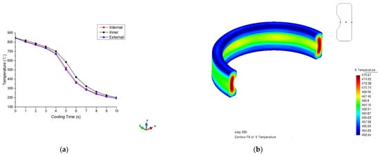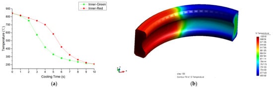 From about 5 s to 6 s, the maximum rate occurred, with peaks occurring in this range. As time passed, the decrease in the heat transfer coefficient and effects from the latent heat of the phase transition caused the cooling rate to gradually decrease and level off. As can be seen from the cloud diagram in Figure 10b, for quenching at 10 s, the temperature difference between the center of the section and the circumferential surface was more obvious due to the small distance of the part cores from the inner and outer surfaces, with a linear spacing of 2 mm. The temperature trend on the inner and outer surfaces was slower than on the top and bottom surfaces of the part.