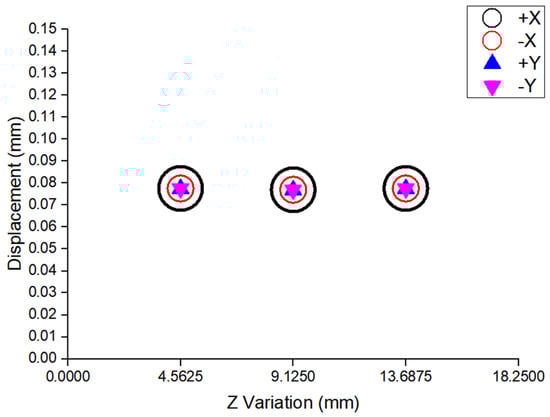From Figure 11, it is obtained that each area of the bearing outer ring deformation was relatively uniform, the deformation trend was close to axial symmetry distribution, and the maximum value was approximately 0.08 mm. When the model was enlarged by 50 times, it still presented a round shape. In order to compare the results with the experiment, we referred to the method of height selection in the ellipticity measurement experiment; four quadrants on the outer surface were measured at different height positions, as shown in Figure 12. The X-axis represents the part height position and the Y-axis represents the deformation value of each quadrant point in different height positions. At any height position, the deformation values of the four quadrant points were almost equal. This proves again, from the result, that there is uniform deformation in the circumferential direction by axial symmetry heat transfer.