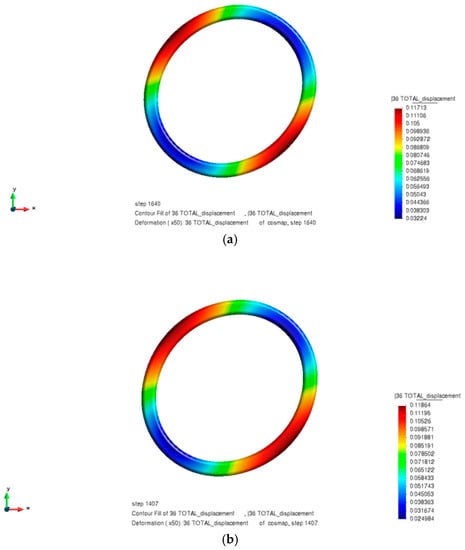 Deformation (×50) by orthogonal symmetric heat transfer and orthogonal symmetric heat transfer on the outer surface, axial symmetry heat transfer on the inner surface. (a) Deformation (×50) by orthogonal symmetry heat transfer; (b) deformation(×50) by orthogonal symmetric heat transfer on the outer surface and axial symmetry heat transfer on the inner surface.