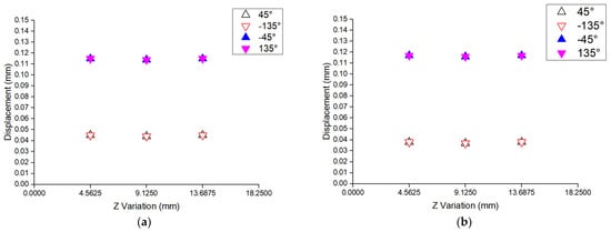 Maximum and minimum deformation in different height directions. (a) Results of orthogonal symmetrical heat transfer; (b) Results of external orthogonal symmetrical and internal axial symmetry heat transfer.