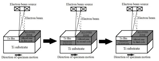 The Ti-Ta coatings were fabricated by an electron-beam additive technique. A Ta film with a thickness of 4.2 μm was deposited on a pure Ti substrate by direct current (DC) magnetron sputtering, followed by an electron-beam treatment in order to form the Ti-Ta coating. The deposition process took place in the Ar atmosphere. The working pressure was 1.2 × 10−1 Pa, the discharge current was 1 A, the discharge voltage was 440 V, and the deposition time was 90 min. The electron-beam treatment procedure was carried out using Leybold Heraeus (EWS 300/15–60, Leybold GmbH Cologne, Germany) electron-beam equipment in a circular manner of scanning. In this case, the electron-beam trajectory overlapped, leading to a significantly longer lifetime of the melt pool and homogeneous structure of the formed surface alloy. During the electron-beam experiments, the accelerating voltage was 50 kV, the beam power was 30 mA, the speed of the specimen motion was 5 mm/s, and the scanning frequency of the electron beam was 200 Hz. On the already-formed Ti-Ta surface alloy by the electron-beam treatment process, the same Ta film with a thickness of 4.2 μm was deposited. The sample was then again subjected to an electron-beam modification for the formation of the second cycle. The same procedure was repeated for the third cycle. A scheme of the electron-beam cycling additive technique is presented in Figure 1.