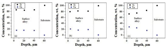 Cross-sectional scanning electron microscopy (SEM) images of the Ti-Ta coatings formed after each cycle are shown in Figure 2. Figure 2a presents the coating obtained after the first cycle; Figure 2b exhibits the coating obtained by the second cycle; and Figure 2c presents the coating formed by the third cycle. In all considered cases, the Ti-Ta zone (i.e., the electron-beam alloyed zone) was indicated as zone A and zone B was assigned to the base titanium substrate. No significant difference in the thicknesses of the obtained Ti-Ta coatings could be observed as in all cases, it was about 50 μm. It was well visible that homogeneous coatings in the system of Ti-Ta were formed after each technological cycle. The chemical composition of the specimens was studied by energy-dispersive X-ray spectroscopy (EDX) and the results are presented in Table 1. The elemental distribution from the surface to the deeper parts of the alloyed zone after each cycle is shown in Figure 3. It was obvious that after each cycle, the Ta concentration increased. After the application of the first cycle, it was about 15 wt.% and the tantalum element was relatively homogeneously distributed within the alloyed zone (i.e., about 15.7 wt.% on the top of the alloyed zone and decreased to 14.6 wt.% in depth). However, the distribution of the Ta element in the specimens obtained by the second and third cycles was much more complex. In both cases, it decreased from the surface to the bulk. Considering the second cycle, it was about 20 wt.% on the top of the surface and decreased to about 18 wt.% at the deeper part of the alloyed zone. This effect was much more pronounced in the third cycle, where the Ta amount was about 27 wt.% on the surface and decreased to 16 wt.% at the deeper zone of the Ti-Ta coating. According to the literature, the distribution and melt homogenization during electron-beam alloying processes is based on the convection flows caused by the high-temperature gradient within the melt pool []. In the first cycle, an electron-beam surface alloying of Ta film with pure Ti substrate was realized and, at the present technological conditions, the heat input is enough for melt homogenization and homogeneous distribution of the Ta element within the alloyed zone. In the second and third cycles, an electron-beam surface alloying of Ta film with the already-formed result by the first cycle on the Ti-Ta structure was realized and, in these cases, the thermal gradient within the melt pool was different due to the different thermophysical properties of the pure titanium and Ti-Ta alloys. In the second and third cycles, the lifetime of the molten material, as well as the intensity of the convection flows, were lower than in the first cycle, leading to the less homogeneous distribution of the Ta element in the second and third cycles.