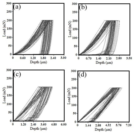 Penetration curves of the indenter at the measurement of (a) Ti substrate; (b) Ti-Ta coating after the first cycle; (c) Ti-Ta coating after the second cycle; and (d) Ti-Ta coating after the third cycle.