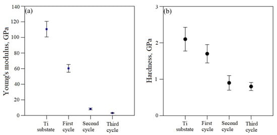 (a)Young’s modulus and (b) hardness of the Ti substrate and the Ti-Ta coatings formed after each cycle.