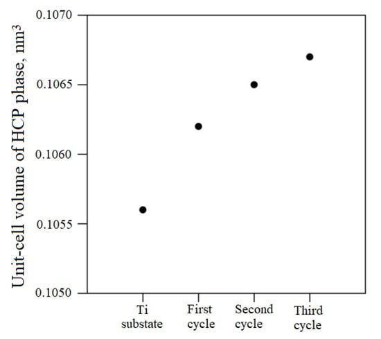 The measured values for the Young’s modulus and hardness of the Ti-Ta coatings were studied by nanoindentation experiments and the results are shown in Figure 6 and Table 2. Additionally, the pure Ti substrate was subjected to nanoindentation investigations for comparison. The results obtained show that both mechanical characteristics decrease after each technological cycle. The measured value of the Young’s modulus of the pure Ti substrate was about 110 GPa and dropped to about 65 GPa for the first technological cycle; further decreased to about 8 GPa after the second one; and reached a value of about 3 GPa in the case of the application of the third procedure of electron-beam alloying. Therefore, with an increase in the Ta concentration within the alloyed zone, the Young’s modulus decreased. Similarly, the measured hardness of the pure Ti was about 2.1 GPa and decreased to 1.7 GPa in the case of the first technological cycle, to 0.87 GPa for the second one, and to 0.79 GPa for the third one. A number of aspects can influence the discussed mechanical characteristics. According to the authors of [,,], the phase composition of the coating has major importance for the resultant mechanical properties. In the case of titanium alloys, the β phase is characterized by the lowest Young’s modulus and hardness among all Ti-based phases (i.e., α-Ti, as well as α’ and α’’ martensitic structures). This statement is in agreement with the results obtained in the present study, where the application of each technological cycle led to an increase in the Ta content in the formed Ti-Ta surface alloy and a larger amount of beta phase. Additionally, the discussed mechanical characteristics strongly depended on the bonding forces between the atoms, which, besides the crystal structure, can be also affected by the distance between the atoms and can be influenced by a large number of aspects, namely the addition of alloying elements, heat treatment, and others. In the present particular case, each technological cycle led to an increase in the Ta amount, which could influence also the bonding forces and atomic distance. The unit-cell volumes of the α’ phase were quantitatively evaluated from the experimentally obtained XRD patterns and the results are presented in Figure 7. The results show that the unit-cell volume of the HCP structure increased. According to the authors of [], the electron-beam surface treatment and modification procedure lead to an increase in the lattice parameters and unit-cell volumes of the materials, which is completely in agreement with these results. This means that the distances between the atoms increase as well, leading to weaker bonding forces. Therefore, the decrease in the Young’s modulus and hardness can be explained as follows: firstly, the discussed mechanical characteristics decreased due to the increase in the amount of the beta phase after each technological cycle; secondly, the drop in the discussed characteristics could be attributed to the increase in the unit-cell volume of the main phase (i.e., the hexagonal closed-packed martensitic), meaning that the atomic distance increased and the atomic bonds became weaker after the application of each technological cycle.