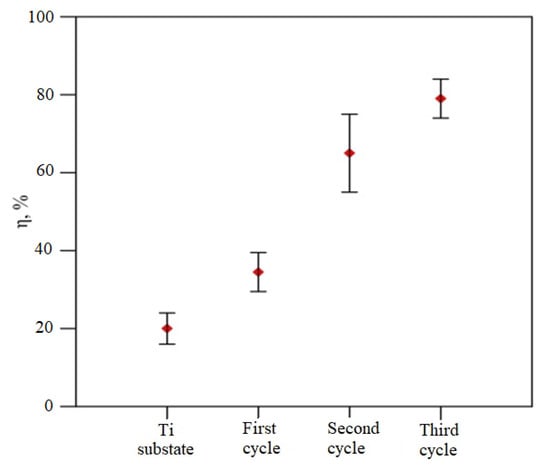 The super-elasticity of the obtained Ti-Ta coatings, as well as of the base Ti substrate, was studied by the depth recovery ratio (η) and the results are presented in Figure 8. As already mentioned, the super-elastic behavior is typical for the shape memory alloys []. In this study, η was evaluated according to Equation (1). The results obtained show that the depth recovery ratio increases after each technological cycle. The calculated value of the base Ti substrate is about 20% and it increased to about 35% after the first cycle, further increased to about 65% after the second one, and to about 80% after the third. Therefore, after each technological cycle, the depth recovery ratio increased. According to the authors of [], higher values of η correspond to higher resistance to plastic deformation. This is again in agreement with the results of our study, where the H3/E2 and H/E ratios increased with an increase in the number of technological cycles.