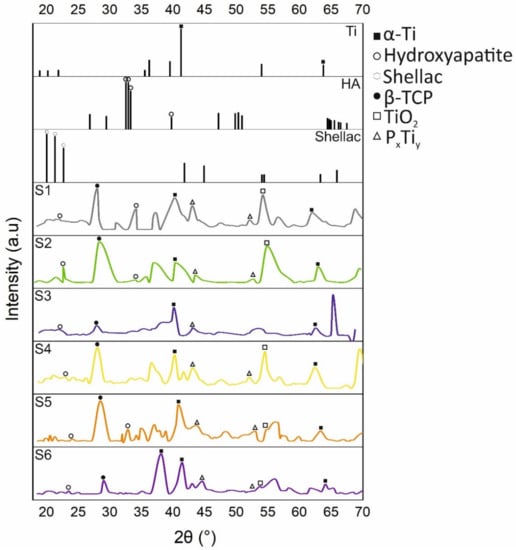 XRD patterns of the initial materials (titanium; hydroxyapatite; shellac) and the Ti-HA composites (S1–S6).