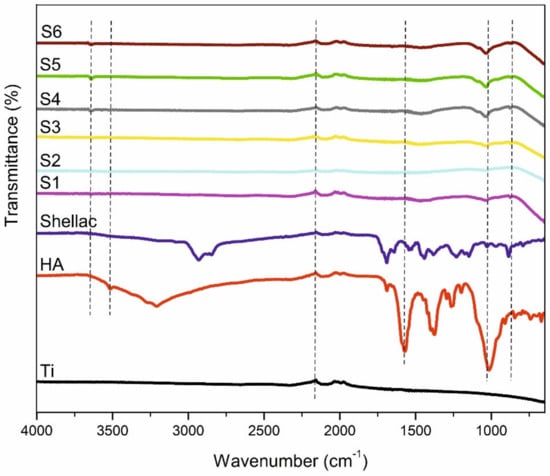 FT-IR spectra of the initial materials (titanium; hydroxyapatite; shellac) and the Ti-HA composites (S1–S6).
