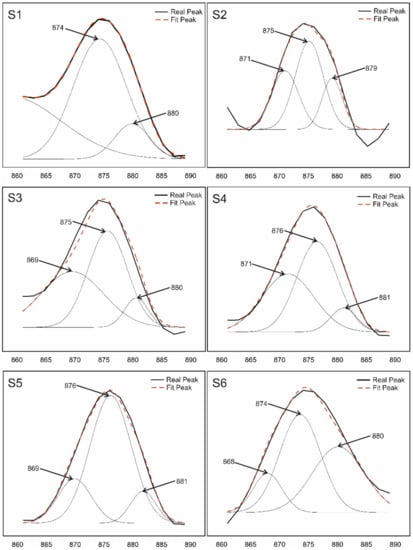 Deconvolution region at 800–920 cm−1 for carbonate groups of the Ti-HA composites (S1–S6).