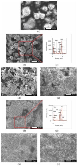 Scanning electron microscopy (SEM): (a) shellac-coated hydroxyapatite before sintering; Ti-HA composites (b) S1, (d) S2, (e) S3, (f) S4, (h) S5, and (i) S6. Energy dispersive X-ray (EDX) analysis: (c) S1 and (g) S4.