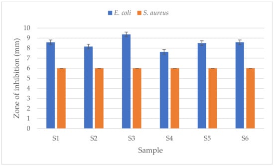 Zone of inhibition: Ti-HA composites (S1–S6) with concentrations of 100 mg/mL against Escherichia coli and Staphylococcus aureus bacteria.