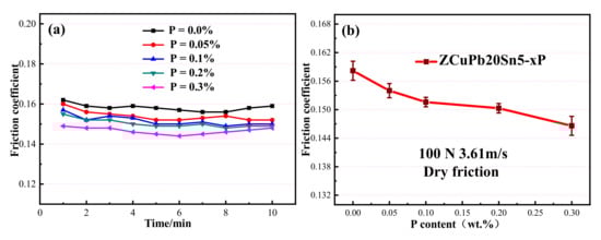 Friction curve of ZCuPb20Sn5−xP alloy under dry friction (a) time; (b) P content.