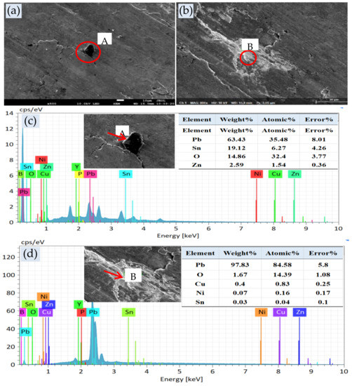 SEM of ZCuPb20Sn5−0P alloy; (a) Selection A; (b) Selection A; (c) EDS of A; (d) EDS of B. A is Cu3P, and the B is Pb.