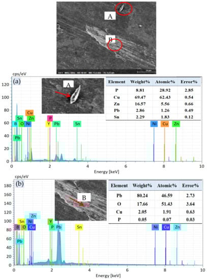 Analysis of friction topographies of ZCuPb20Sn5−0.3P : (a) EDS of A; (b) EDS of B. A is Cu3P, and the B is Pb.