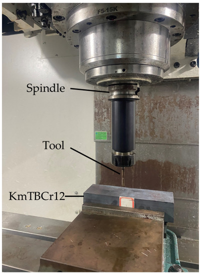 The milling test was conducted by a Qifa Machinery Vertical CNC Milling Machine Center (VH-850L3, Qifa, Taizhong, Taiwan), as shown in Figure 1. The high-chromium cast iron KmTBCr12 was used as workpiece material; the composition of KmTBCr12 is listed in Table 3. The tool geometry and milling parameters are shown in Table 4. This study adopted the method of forward-milling. Because the cutting speed has a significant impact on the life of the tool, according to the characteristics of the machining center of the milling machine, the cutting speeds were set as 85, 105, and 125 mm/min, respectively. The cutting depth was kept at 0.2 mm, and the feed rate was kept at 0.2 mm/r. All the milling tests were paused at each interval cutting length of 3 cm, and the real-time flank wear of coated tools was measured via an optical microscope. Generally, average flank wear of 0.3 mm is designated as the failure standard. The workpiece processed in this paper belongs to difficult cutting materials, and the diameter of the cemented-carbide milling tool is small. In order to ensure the machining quality of the workpiece, average flank wear of 0.1 mm was assigned as the failure standard.