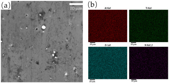 The surface morphology of the coating obtained by SEM is shown in Figure 2a. There are microscopic defects such as white particles and pits on the surface of the coating; this is because, in the process of ion plating deposition, droplets splashed and adhered to the surface of the coating. The defects will seriously affect the surface quality of the coating, and the surface defects can be reduced by adjusting process parameters [26,27,28]. The elements of the AlTiZrN coating were scanned by EDS, and the distribution of each element is shown in Figure 2b. It can be seen from the figure that the distributions of the Al and Zr element are relatively uniform, while that of the Ti and N elements are relatively dispersed, which are related to the ratio of each component of the target and N2 flow rate.