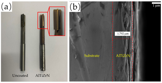 Uncoated tools and AlTiZrN-coated tools are shown in Figure 4a, and the colour of the AlTiZrN coating is golden yellow. The cross-sectional morphology of the AlTiZrN coating and substrate is shown in Figure 4b. The measured thickness of the coating was about 1.792 μm, and the coating was dense, well-bonded with the substrate, and had no obvious gap. There were some pits on the top of the coating caused by the uneven cutting of the sample. The chemical composition of the deposited coating was analyzed by the EDS software of the SEM. The results are shown in Table 6.