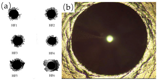For coated tools, the bonding strength between the coating and substrate will affect the cutting performance and life of the tools to a certain extent. Due to the complex shape of the tool, it is impossible to accurately measure the bonding strength of the coating. Therefore, this paper chose to use a Rockwell hardness tester to test the bonding strength of the coating on the surface of YG8 samples. Figure 5a shows the standard diagram for judging the bonding strength between the PVD coating and substrate. Under the HF1~HF4 standards, slight cracks were generated around the indentation opening, which is the qualified bonding strength. Under the HF5 and HF6 standards, the coating near the indentation opening was peeling, and the strength was unqualified. The indentation morphology of the AlTiZrN coating on the surface of the cemented carbide was observed by an optical microscope, as shown in Figure 5b. There are only cracks around the indentation, and the coating did not peel. By comparing the number and shape of cracks, it can be judged that the bonding strength between AlTiZrN coating and cemented-carbide substrate meets the HF3 standard.