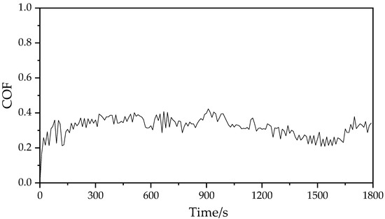 Coefficient of friction (COF) is another index to measure the mechanical properties of the coatings. For fine machining tools, the COF of the surface is the main parameter that reflects the cutting performance. The smaller the COF, the smaller the machining deformation of the tool, and the better the cutting ability when the cutting force is reduced. The COF curve of the AlTiZrN coating measured by the friction and wear tester is shown in Figure 6. The COF curve of the AlTiZrN coating fluctuates in the range of 0.2~0.4. After calculation, the average value of COF is 0.32. In [14], COF values of 0.65 were reported for AlTiN-TiSiN coating deposited on the nitrided tool steels. In [34], COF values between 0.62 and 0.68 were reported for AlCrN coatings deposited on HS6-5-2 steel substrates, and in [35], values of around 0.5–0.75 were reported for nanocomposite TiAlN coatings deposited on different steels. Therefore, the AlTiZrN coating prepared in this paper had a better COF.