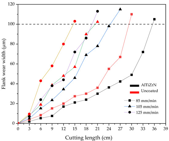 Relationship between flank wear and cutting length of the uncoated and AlTiZrN-coated tools at different cutting speeds.