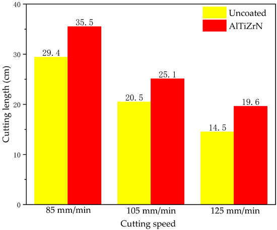 Cutting length of the uncoated and AlTiZrN-coated tools at different cutting speeds.
