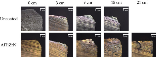 Figure 9 shows the relationship between flank wear and cutting length of an uncoated tool and an AlTiZrN-coated tool at different wear stages at a cutting speed of 125 mm/min. In the early stage of the cutting process, the wear of the two kinds of tools was relatively uniform, which was simple flank wear, and the uncoated tool wore down at a greater rate at the same cutting distance. With the increase in cutting distance, the cutting edge of the tool gradually dulled. When the cutting distance was 9 cm, the micro-edge collapse of the two kinds of tools occurred, which led to a decline in cutting performance [36].