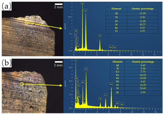 EDS analysis of the flank surface of the AlTiZrN-coated tools at a speed of 125 mm/min: (a) the cutting length is 9 cm; (b) the cutting length is 15 cm.