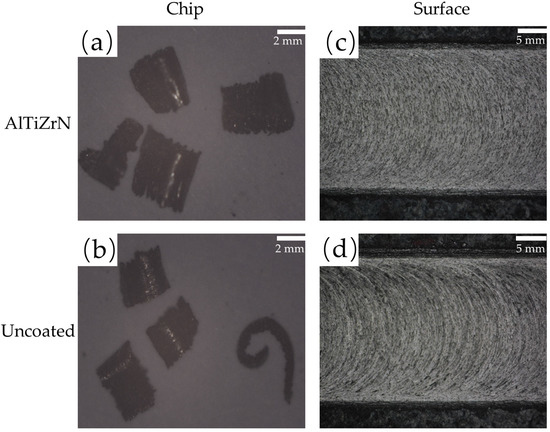 Under different cutting conditions, the shapes of chips produced by cutting KmTBCr12 are also different. Figure 11 shows the chips produced by the uncoated tools and AlTiZrN-coated tools when the cutting length was 9 cm at the speed of 125 mm/min. The chips produced by the two kinds of tools are curled, but the chips produced by coated tools are generally shorter, which indicates that the coated tools have a better chip-breaking performance than the uncoated tools, and the coated tools are more suitable for cutting. Figure 11c,d shows the machining path of the tool on the workpiece surface. Combined with the wear diagram of the flank in Figure 9, it can be seen that the wear of the coated tool was relatively slight, the scratches were more uniform and smooth, and the surface quality of the workpiece was good. The cutting edge of the uncoated tools was seriously worn, the scratches were more rough and uneven, and the surface of the workpiece was rough. Therefore, it can be judged that under the same conditions, the coated tool has better chip-breaking performance and good machining surface quality.