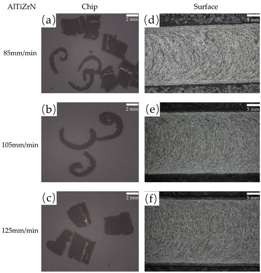 When the cutting length is 9 cm, the chips and machining path produced by the AlTiZrN-coated tools at different cutting speeds. (a,d) 85 mm/min; (b,e) 105 mm/min; (c,f) 125 mm/min.