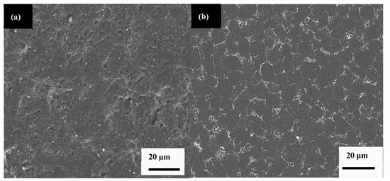Figure 1a shows the secondary electron SEM image of PcBN. It is clear that PcBN shows dense microstructure without pores. The backscattered electron SEM image of PcBN was investigated to understand the distribution of binder, as shown in Figure 1b. The darker regions correspond to cBN grains and the lighter regions correspond to binder phases. The XRD of the PcBN can be seen from reference [13], and the binder phases are AlN, CoN, and CoB. It is seen that the binder phases of PcBN are distributed discontinuously, presenting the formation of mutual penetrating skeletons. The results indicate that the original PcBN is a homogeneous compact.