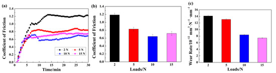 (a) Time dependent of CoF; (b) average CoF under different loads; (c) wear rate of AISI 52100 under different loads.