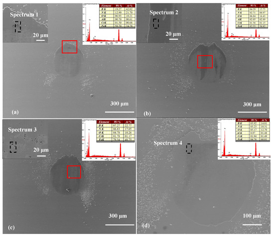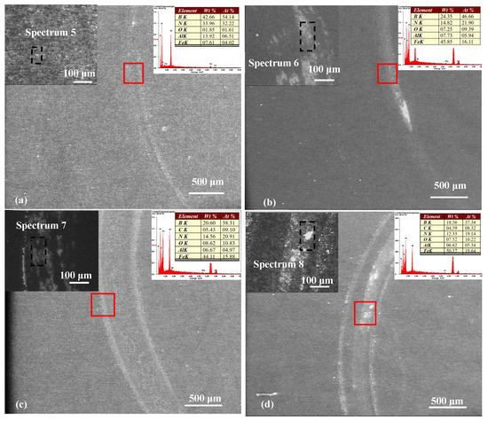 Figure 3 presents the wear morphologies of wear scars on AISI 52100 balls under different loads. Overall, it is observed that the adhesive layers are on the surface of AISI 52100 balls. In order to characterize typical features of wear scars, highly magnified SEM images were investigated on red box regions. It is seen that the small grains are embedded on the surface of wear scars, as shown in the typical pictures of Figure 3a,c inserts. The appearance of small grains is caused by the Hertz contact stress. EDS results display the high content of element B and N, which indicate the existence of cBN grains. The cBN grains act as the three-body material between the tribopairs. Thus, the main wear mechanisms of AISI 52100 are adhesive wear and abrasive wear. Under the combination of high contact stress and friction heat, AISI 52100 metal materials with soft hardness formed an adhesive layer. In addition, the exfoliated cBN grains are embedded into the adhesive layer of the contact surface as abrasive particles, resulting in abrasive wear. Furthermore, the adhesive layer results in a downward trend of CoF and the wear rate of counterpart balls. Thus, there is a strong mutual influence on CoF and wear mechanisms, which are dominated by the loads.