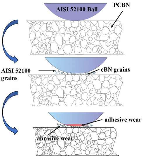 (2) The wear forms of PcBN-AISI 52100 tribopair are mainly adhesive wear and abrasive wear. With the increase in loads, adhesive wear is dominated the surface and interface conditions. The accumulation of friction heat and the high load are responsible for the adhesive layer. The abrasive wear is ascribed to falling-off cBN particles, which act as the hard phase on friction surfaces.