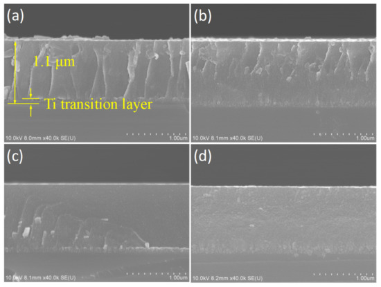 SEM images of cross-sections of Ti-DLC coatings prepared at varied substrate bias: (a) −50 V, (b) −100 V, (c) −200 V, and (d) −300 V.