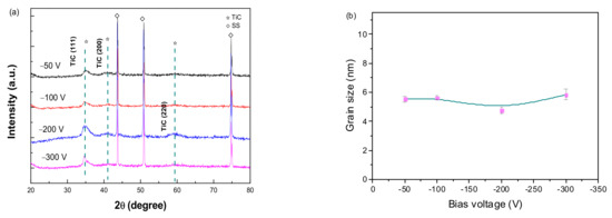 The XRD pattern of Ti-DLC coatings prepared at varied bias voltages are given in Figure 4a. The diffraction peaks (1 1 1), (2 0 0), and (2 2 0) of TiC (ICSD 89-3828) at 35.8°, 41.6°, and 60.4°are observed. The peaks of (2 0 0) and (2 2 0) are less obvious. As seen in Figure 4a, the intensity of the TiC (1 1 1) peak increases first and then decreases. The preferential orientation of (111) is related to the surface energy [24]. The variation in intensity and width of diffraction peaks can reflect the crystallinity and grain size of the coatings. The grain size of the Ti-DLC coatings prepared under varied bias voltage calculated from TiC (1 1 1) peak is presented in Figure 4b. With the increase in substrate bias, the grain size of coating at −200 V is smallest, however, the grain size of the Ti-DLC coatings is almost consistent, which is around 5.4 nm. The increased ion beam energy with increase in negative bias would promote nucleation and reduce grain size. The grain size is also related to the temperature of the substrate. The high ion energy could lead to an increase in substrate temperature and the diffusion length of surface-migrating atoms facilitates the atomic migration and grain growth [25]. Consequently, the grain size decreases first and then increases with increasing bias voltage.
