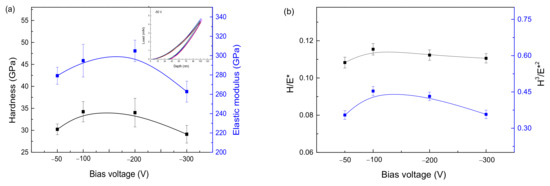Hardness (H) and Young’s modulus (E) of the Ti-DLC coatings prepared at different bias voltages are shown in Figure 6a. As displayed, the H (E) increases from 30.23 GPa (279.23 GPa) to 34.24 GPa (304.92 GPa) with an increase in bias voltage from −50 V to −200 V. Increasing bias voltage to −300 V, the H and E present the lowest values of 29.11 GPa and 262.8 GPa, respectively. The ratios of H/E* (E*, effective Young’s modulus) and H3/E*2 are related to the elastic strain to failure and the plastic deformation resistance of the coatings [30,31]. The results of H/E* and H3/E*2 of all prepared coatings are given in Figure 6b. As seen, although H/E* and H3/E*2 first increase and then decrease with increasing bias voltage, which shows the same trend with the results of H and E, the coatings at −100 V exhibit the highest values of H/E* and H3/E*2 of 0.12 and 0.45, respectively. Thus, the coating prepared at −100 V has the best durability and plastic deformation resistance among all coatings [32]. The high hardness of the coating mainly due to the hardness enhancement mechanism of the nanocomposite coating. The strong interface between nanocrystalline and amorphous phases can effectively prevent dislocation migration and crack propagation, which can improve the H and E of the coating [33]. Some researchers attribute increased hardness of Ti-DLC coating with increasing bias voltage to increased coating density during the growth of the coating [34]. In addition, according to the mechanism of hardness enhancement, the hardness of the Ti-DLC coatings is related to the content of TiC, grain size, and the integrity and thickness of the amorphous carbon [35,36]. According to the results of XRD, the coating at −200 V shows small TiC grain size. From the results obtained above, the dense structure, small grain size, and the fine content of TiC phase may be mainly accountable for the high hardness, H/E*, and H3/E*2 of coating at −100 V and −200 V.