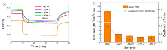 According to the results of potentiodynamic polarization curves, the coating at −50 V has high porosity compared to the coating prepared at −100 V and −200 V. Manhabosco and other researchers [41] found that porosity has a huge influence on electrochemical performance of the coating, which could promote the diffusion of water and erosive ions penetrating into the coating, resulting in localized delamination of the coating. During the tribocorrosion test, simultaneous action of friction and corrosion aggravate failure of the coatings, and the diffusion channels of the corrosive medium would be supplied by the micro-cracks, furrows, and desquamation caused by friction force, which leads to the degradation of the coatings [44]. The high porosity of 0.091 of coatings prepared at −50 V would promote the penetration of the erosive ions, which could weaken the adhesion of the coating and substrate, then, under the action of mechanical wear, thus desquamation is observed on the wear scar (Figure 10a). Thereby, the coating at −50 V shows the lowest OCP during the tribocorrosion test. The results of coating at −300 V are similar to the coating prepared at −50 V.