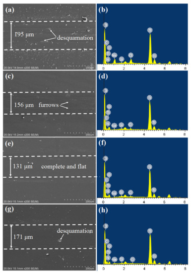 The worn surface and corresponding EDS are given in Figure 10. As shown, the width of wear track of coating at −50 V is 195 μm, and obvious desquamation is observed on the wear scar, which is caused by the interaction of corrosion and wear. The EDS results (Figure 10b) show that the components of coating on the wear track not only contain Ti, C, O, Si, and N, which belong to coating and counterpart, but also contain Na and Cl, which come from artificial seawater solution. The EDS results of coating at different bias voltages are similar. With the increase in bias voltage, the width of wear track is decreased, and some furrows are observed on the wear scar of the coating at −100 V. The coating at −300 V also shows desquamation on the wear track (Figure 10g), suggesting corrosion solution likely penetrating into the coating and reaching the substrate. Corrosion solution penetrates the coating through the pores, then, under the combined action of friction and corrosion, desquamation and furrows are formed on the worn surface, which could accelerate corrosion and wear and might result in peeling off of the coatings. The generation of desquamation could mainly be responsible for the low OCP value of those coatings.