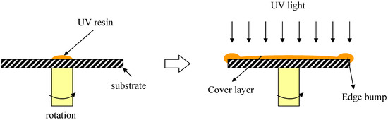 The principle of spin coating is that when a small quantity of liquid is applied to a rotating disk, some of liquid remains on the disk, experiencing thinning as a result of the balance of viscous force and centrifugal force [1]. Since it is quite favorable regarding cost and mass production, the spin coating process has found many applications, for instance, in microcircuit fabrications, magnetic disk coatings, screen display coatings, and digital video disc production. Elmansouri et al. fabricated poly-o-toluidine thin film by spin coating on bare glass and indium-tin-oxide-coated glass [2]. They presented optical transmittance with high absorption in the near infrared region. Thin film synthesis for the creation of a transparent and flat display by spin coating was investigated by Yu et al. [3]. A spin coating method was successfully demonstrated to form a CuAlO2/AIN thin film. A zinc oxide quantum dot-based thin film was synthesized via spin coating technology [4]. The main advantages were simplicity, low processing temperature, and cost effectiveness [5,6]. The sol–gel spin coating technique on an ordinary glass substrate was adopted to fabricate Cu2ZnSnS4 absorber layers for the photovoltaic application [7,8,9,10]. Blu-ray discs and other traditional optical storage media have been manufactured by the spin coating process. This requires highly precise optical cover layer thickness control with cost efficient technology [11]. For cover layer materials with refractive indexes close to 1.5, such as polycarbonate and ultraviolet-curable resins, the maximum deviation of a nominal substrate thickness of 100 μm should not exceed ±3 μm within the recording area [12].