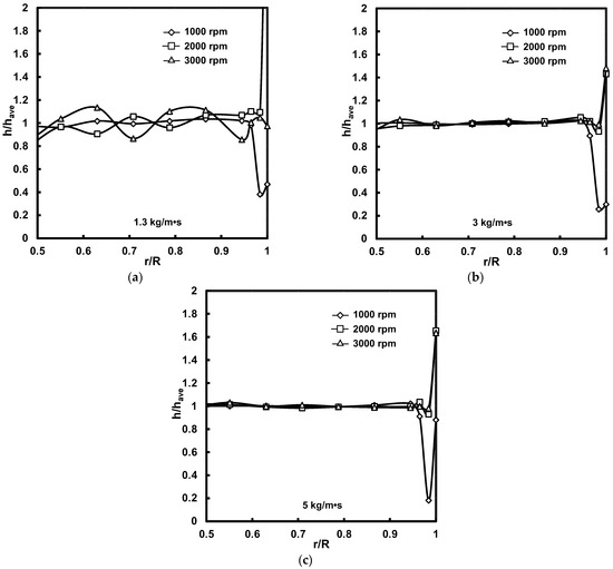 Radial distribution of film thickness: 32 mm disc diameter. (a) 1.3 kg/m⋅s, (b) 3 kg/m⋅s, (c) 5 kg/m⋅s.