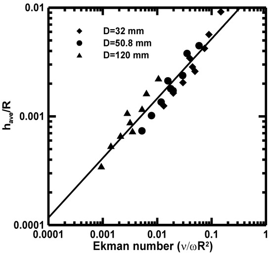 The average film thickness was proportional to the Ekman number, which implies Coriolis force and viscous force were dominant with our experimental conditions. In the case of a constant flow rate, the average film height at a local radius has been described as a function of viscosity, angular velocity, radial distance, and flow rate as well [29,30]. However, the relation in Equation (1) shows that average thickness is independent of flow rate and only depends on Ekman number. In this range of applied mass, no relationship was found between applied mass and thickness in the experimental results. It is thought that the average thickness of the liquid film reached a steady state when the viscous force and the Coriolis force were balanced, so as to maintain constant thickness, which was irrelevant to the masses applied within our experiments. Therefore, the average thickness can be described with the Ekman number. The Reynolds number at the end of disk, which was in the order of 10−4, also supports the validity of the explanation of the film thickness’s dependency on the Ekman number, as such a low Reynolds number means less significance for the flow rate compared to other effects. As a result, the film thickness is proportional to the Ekman number in the relation of Equation (1).