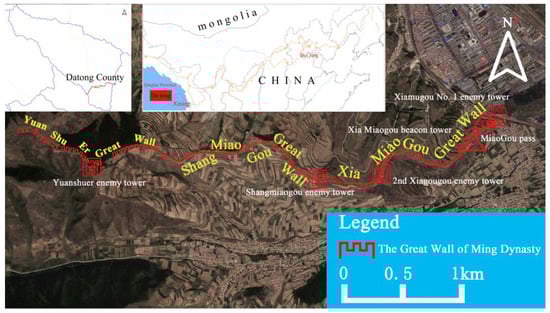 The Datong County is located in the northeastern Qinghai Province, in transition zone of the Tibetan Plateau and the Loess Plateau, and to the south of Qilian Mountain. The Wall in this area, originating from Yongdeng of Gansu via Huzhu of Qinghai, was built in 1572 A. D [22,23,24,25,26] (Figure 1). Construction background, time, and scale of the Ming Great Wall near the Xining area are shown in records by Su (1993) [27] and Yang (2016) [28]. Therefore, the Qinghai Ming Great Wall is an important part of the whole Great Wall in China according to official and historical document. Existing Great Wall in this section consists of wall with a length of 7.6 km and trench (4.8 km), 5 castles, 13 beacon towers, which is the best-preserved Ming Dynasty Wall in Qinghai, was honored as “Badaling of Qinghai” [29]. A fortress easy to defend and difficult to attack was formed by combination of the Wall and lofty and steep mountains and was listed as a red tourist spot [30].