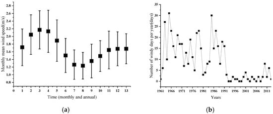 Wind regime of study area (1961–2013). (a) Monthly and annual wind speed means. 1–12 indicate January to December, while 13 gives the annual average. (b) Number of gale windy days per year.