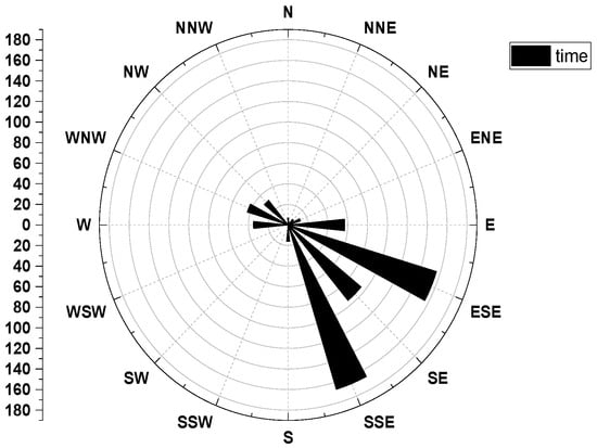Erosion pin method was adopted by Luo et al. (2019) in a 5 year’s field monitoring to Fujian Hakka earth buildings and huge difference in sapping quantity could be found at wall with various angle to prevailing wind direction [11]. Hence, it is necessary to evaluate effect of wind direction on sapping quantity. The relation between wind direction and sapping quantity was evaluated by comparison of sapping quantity at windward and leeward and sapping area and quantity of segments with various azimuth using 20 m as reference unit length according to field investigation and data analysis. As shown in Table 1, azimuth of windward of the Wall ranges from 95° to 245° and leeward from 275° to 65°. Total sapping area of windward is 613.02 m2 and leeward 88.95 m2. Total sapping quantity windward is 136.20 m3 and nearly 10 times of leeward with a sapping quantity of 13.64 m3. Obvious difference in sapping quantity of both sides could be found although the Wall was built with identical rammed earth and located in environment with identical precipitation and evaporation. Besides, huge difference could be observed at windward of the Wall with various azimuth (Figure 7a,c). Maximum of the length of the Wall was 307.79 m with azimuth ranges from 185° to 189° (Figure 6b), while maximum of sapping quantity was 15.57 m3 with azimuth ranges from 145° to 149°. Moreover, it could be concluded that high sapping quantity of the Wall with azimuth ranges from 140° to 154°, which is further confirmation of the relation between wind direction and sapping quantity.