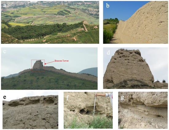 - Ren, X. Resources’ Investigation Report of Ming Great Wall in Qinghai Province; Cultural Relics Press: Beijing, China, 2012; pp. 58–149. (In Chinese) [Google Scholar]