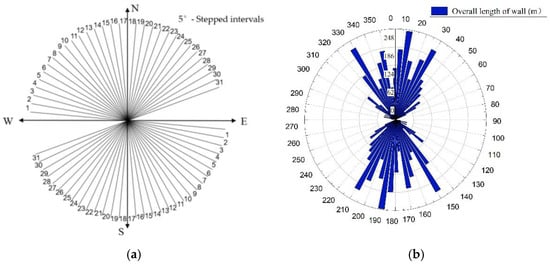 Statistic method and results of length of the Wall. (a) Partition map of the north and south facades of the Great Wall. (b) Length of the Wall with various azimuths.